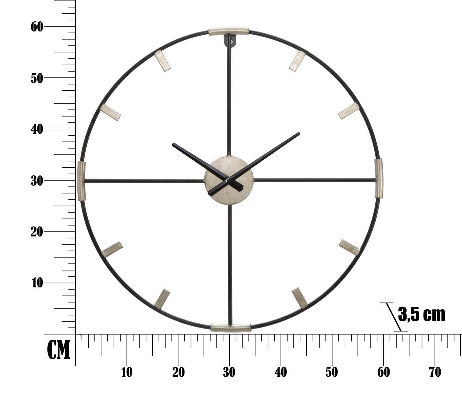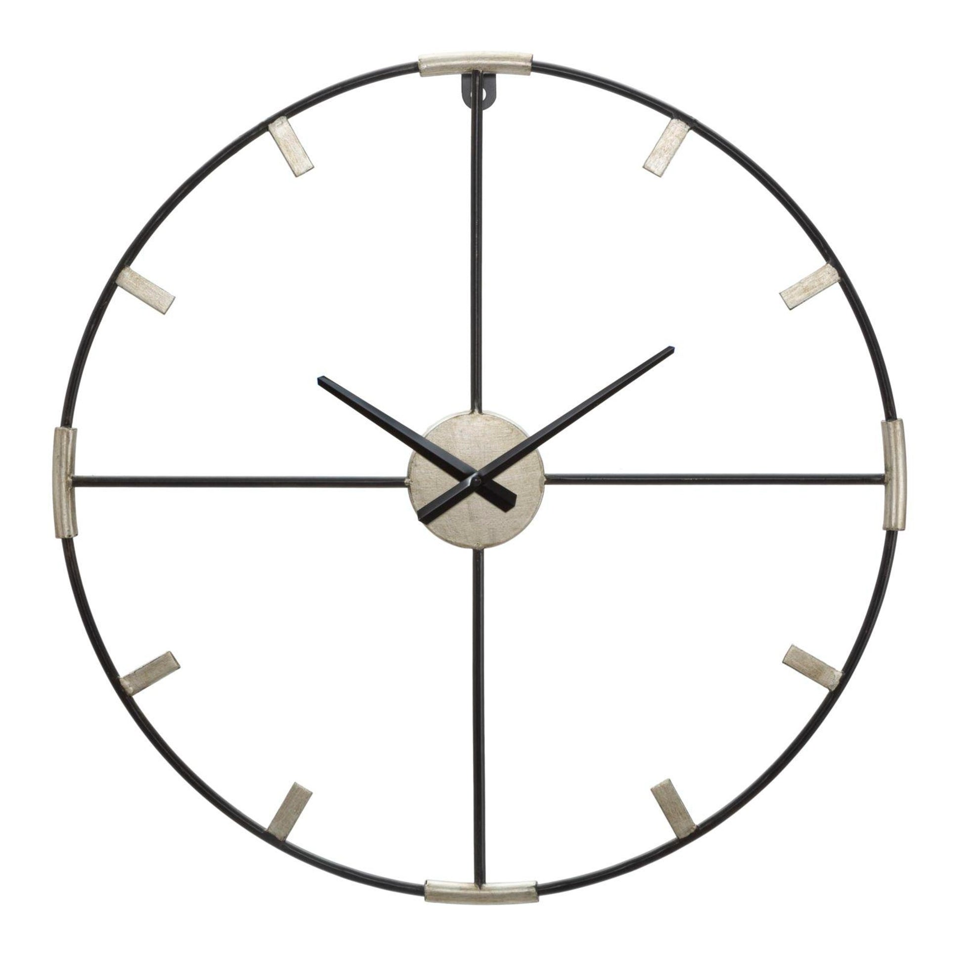 Orologio da parete in metallo nero e argentato. Il design semplice e minimale unito al contrasto argento/oro si sposano alla perfezione ad ogni tipo di arredamento.